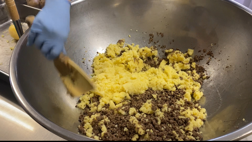 「地場の食材をギュッと詰め込みました。ほとんど機械を使わず、ひとつひとつ手作業で作っています。ホクホクとしたじゃがいもと前沢牛の歯ごたえ、ぜひ揚げたてをご自宅でもお楽しみください。